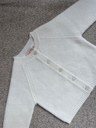 Voici Val, notre cardigan cachemire pour bébé tricoté en point mousse.