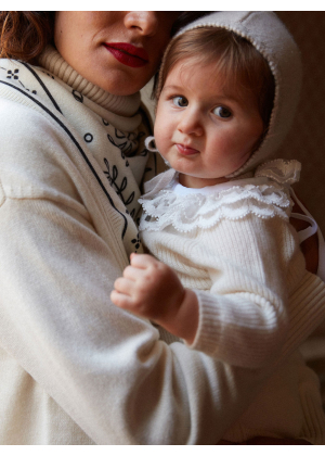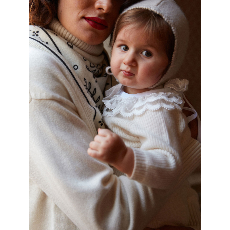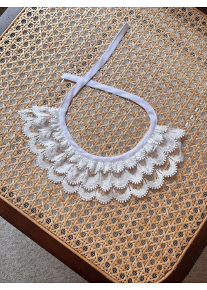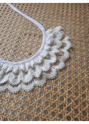 Orné d’une dentelle ajourée aux motifs floraux, il se noue délicatement autour du cou du bébé pour une allure douce et élégante.