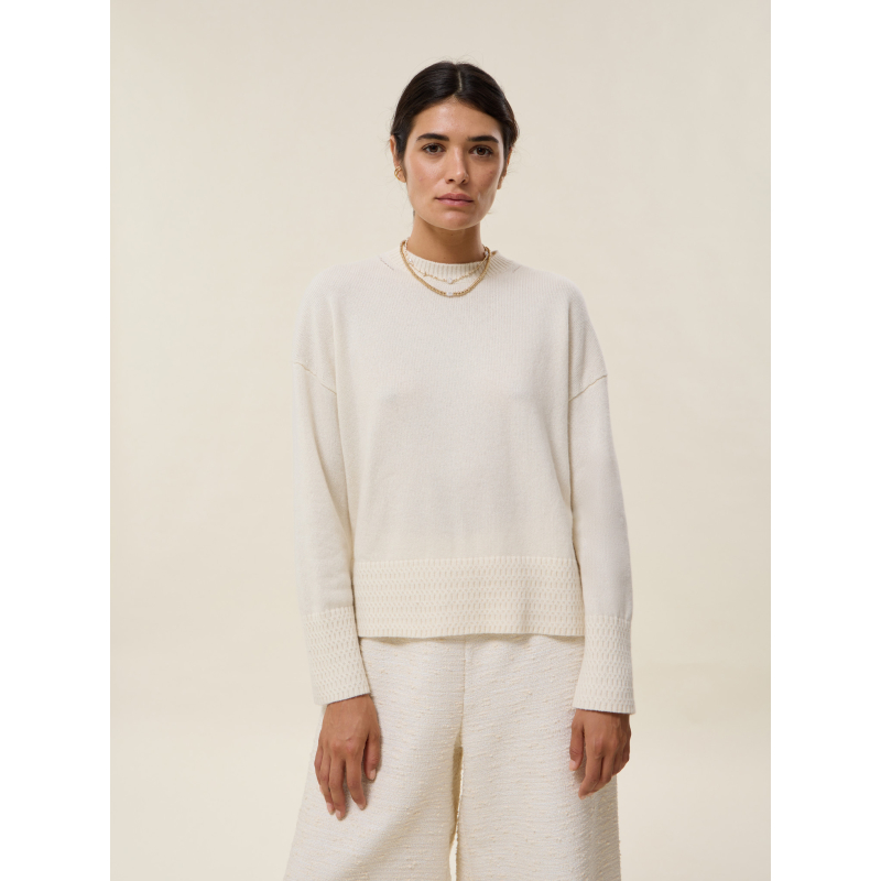 Son petit plus : ses finitions en rib fantaisie sur les manches et le bas du corps, pour une touche subtilement travaillée