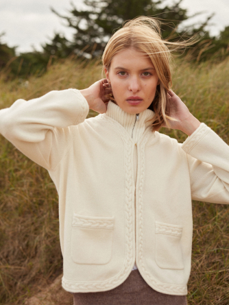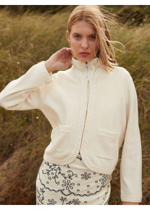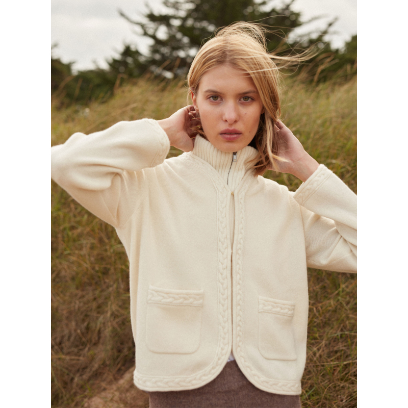 Découvrez Tessa, un cardigan tout en douceur tricoté en 100% cachemire 2 fils. Sa coupe droite et son bas arrondi épousent la silhouette avec légèreté, tandis que ses poches plaquées en font une pièce à la fois pratique et élégante. Le détail de tresse appliquée apporte une note de caractère tout en subtilité.