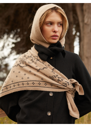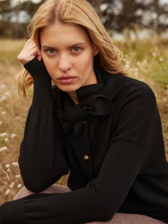 Son col à nouer, prolongé de deux pans, apporte une touche d’originalité et de féminité, évoquant la légèreté d’une lavallière tout en conservant l’esprit décontracté du cardigan.