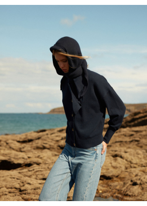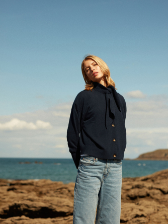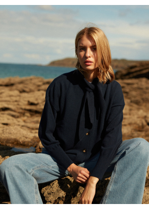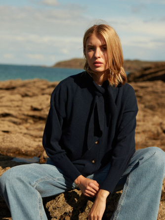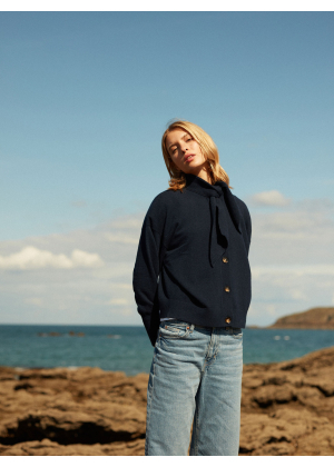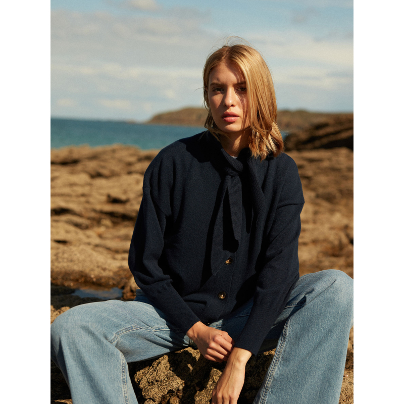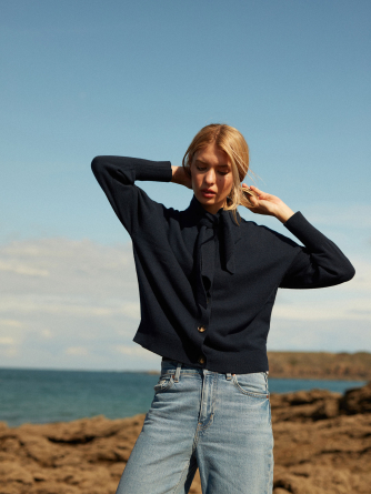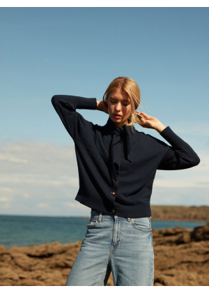 Son col à nouer, prolongé de deux pans, apporte une touche d’originalité et de féminité, évoquant la légèreté d’une lavallière tout en conservant l’esprit décontracté du cardigan.