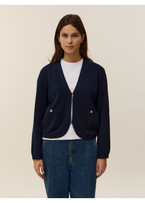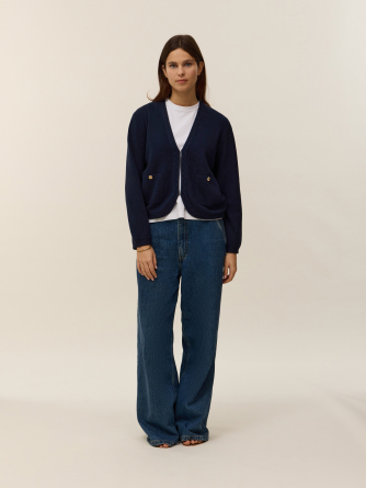 Voici Aimy, notre gilet tricoté en coton cachemire 2 fils.