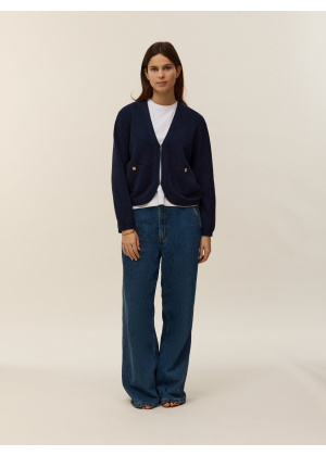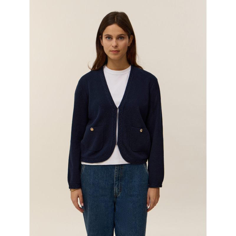 Ses poches plaquées et son bas légèrement arrondi adoucissent la ligne du cardigan, pour une pièce à la fois pratique et élégante.