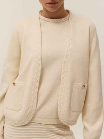 Ses poches plaquées et son bas légèrement arrondi adoucissent la ligne du cardigan, pour une pièce à la fois pratique et élégante.