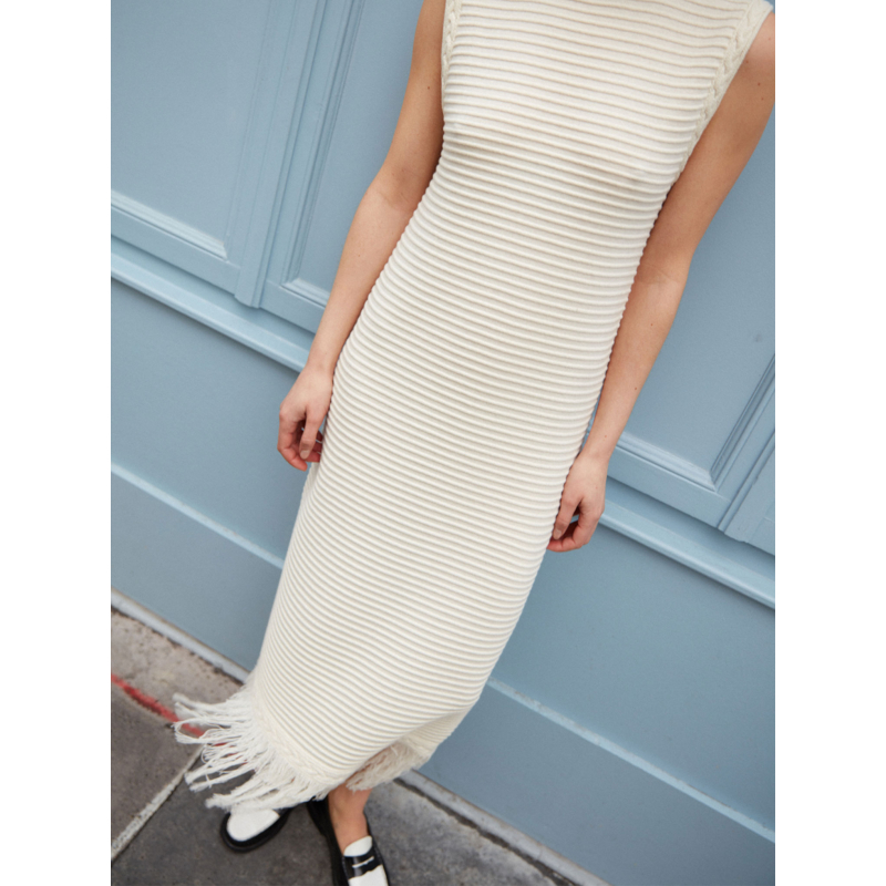 Sa maille côtelée apporte du caractère à la silhouette, tandis que les franges en bas de robe allient originalité et élégance.