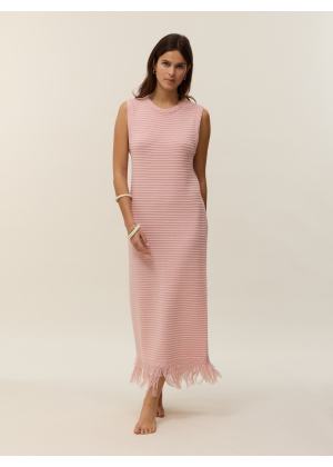Sa maille côtelée apporte du caractère à la silhouette, tandis que les franges en bas de robe allient originalité et élégance.