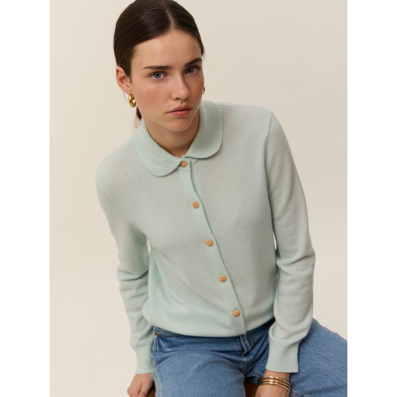Voici Rose, notre cardigan-chemisier en maille 2 fils 100% cachemire, pensé pour allier raffinement et confort. Son col Claudine en point Milano lui apporte une touche rétro et féminine, tandis que sa maille jersey assure un tombé souple et élégant. Sa coupe droite s’adapte à toutes les silhouettes, sublimée par de délicats boutons dorés en guise de fermeture.