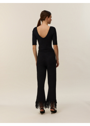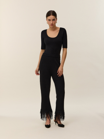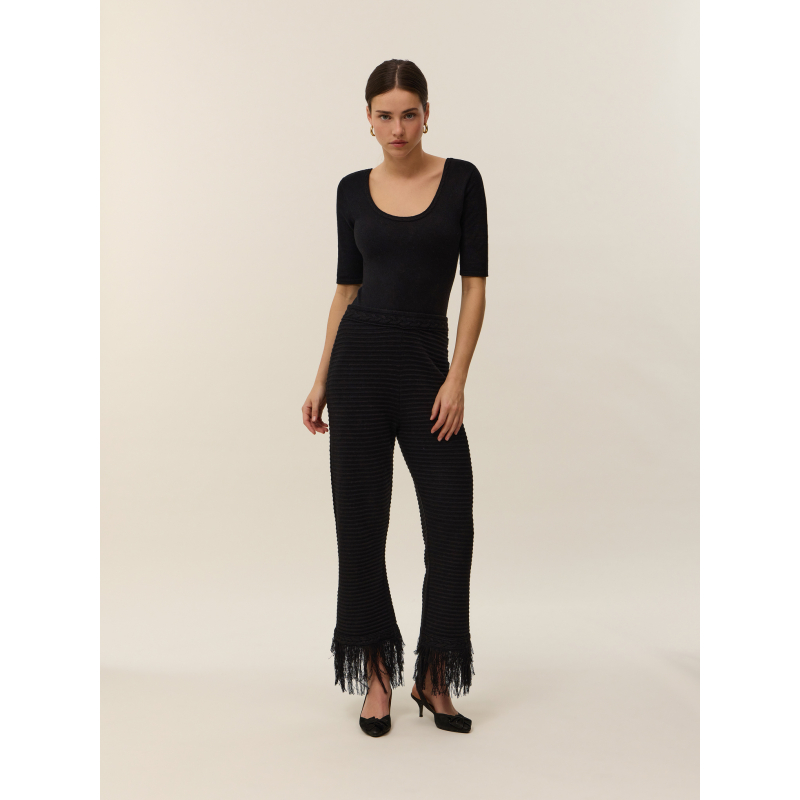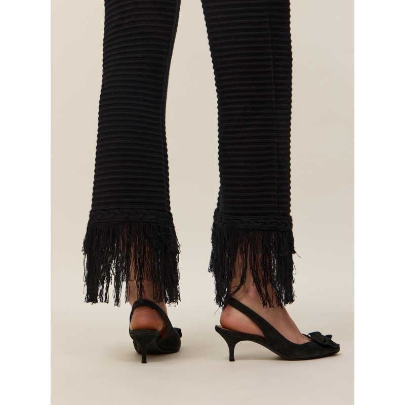 Sa maille côtelée structure la tenue, tandis que les franges en bas de jambe apportent une touche élégante et originale.