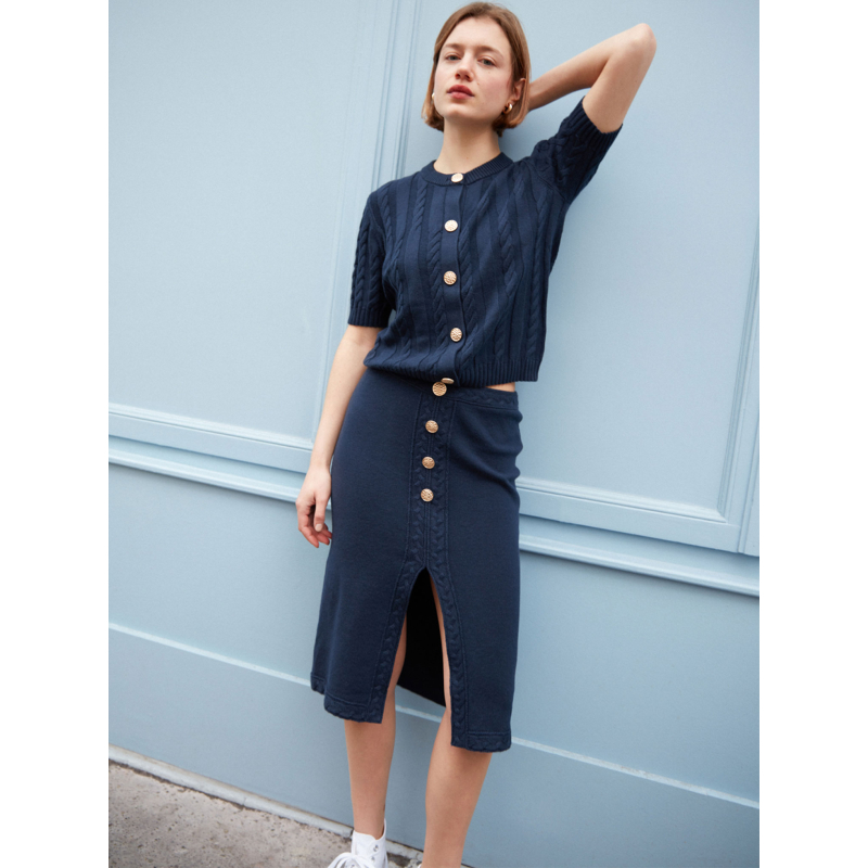 Voici Aimy, notre jupe tricotée en coton cachemire 2 fils.