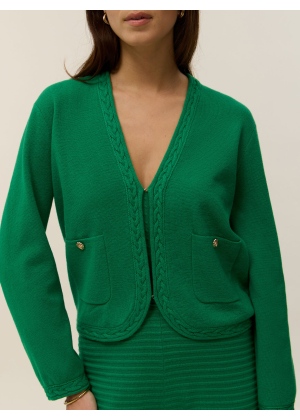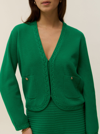 Ses poches plaquées et son bas légèrement arrondi adoucissent la ligne du cardigan, pour une pièce à la fois pratique et élégante.
