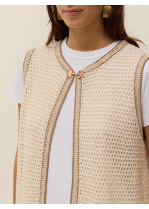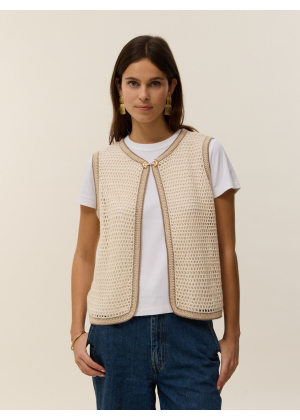 Découvrez le gilet Léonie, tricoté en coton cachemire. Sa coupe droite sans manches et sa maille travaillée avec un motif tressé à torsades sur l’ensemble du vêtement lui confèrent une allure à la fois élégante et intemporelle. Les finitions délicates au crochet apportent une touche artisanale. Facile à associer, il se porte aussi bien sur un top léger que sur une chemise pour compléter vos tenues avec style.