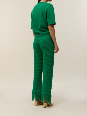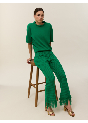Sa maille côtelée structure la tenue, tandis que les franges en bas de jambe apportent une touche élégante et originale.