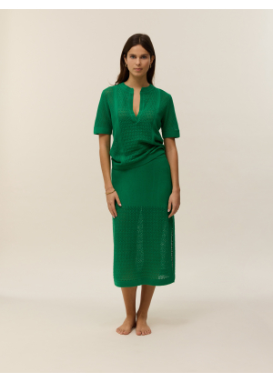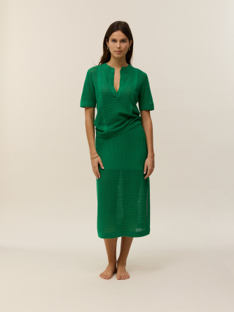 Sa maille délicate en pointelle ajoute une texture subtile qui met en valeur son design épuré et moderne. La coupe flatteuse et le col V soulignent délicatement le décolleté, tout en créant une silhouette raffinée.