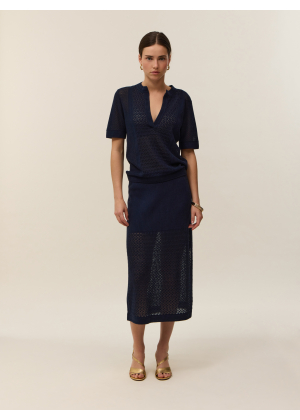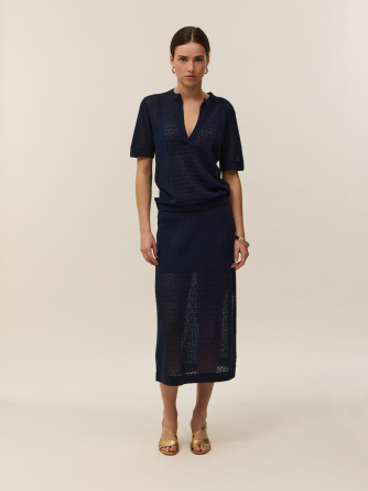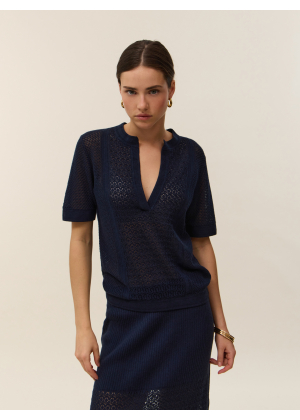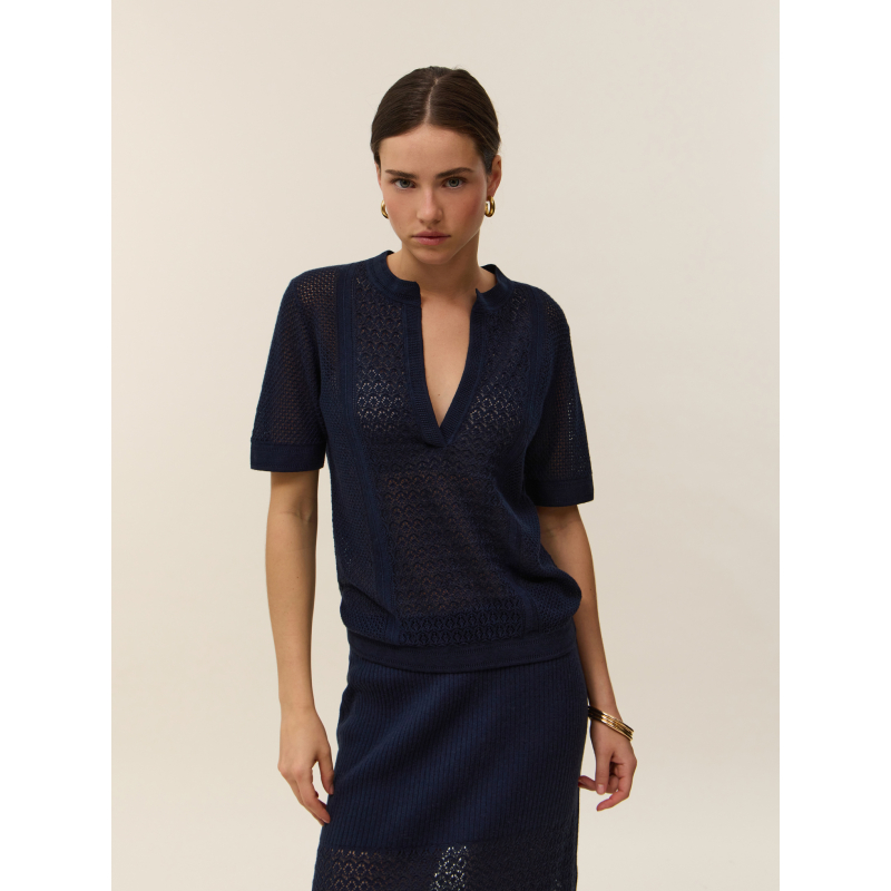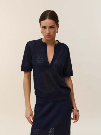 Sa maille délicate en pointelle ajoute une texture subtile qui met en valeur son design épuré et moderne. La coupe flatteuse et le col V soulignent délicatement le décolleté, tout en créant une silhouette raffinée.