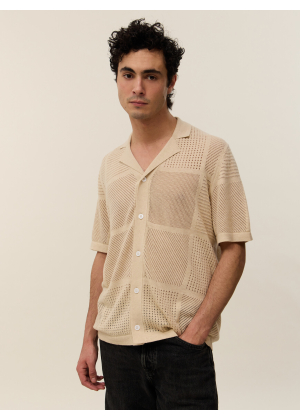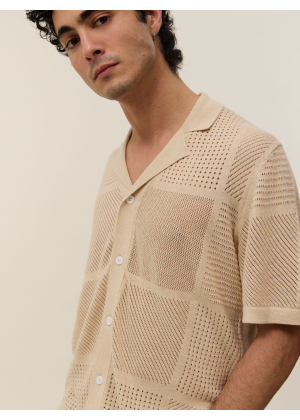 Adoptez Marlon, une pièce d'exception qui floute les lignes entre le polo classique et la chemise. Son col large et sa boutonnière intégrale s'inspirent directement de l'esthétique vintage des années 70, revisitée avec une touche de modernité et de caractère. Sa maille ajourée aux motifs géométriques joue avec la transparence pour un effet résolument graphique et estival.
