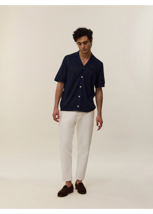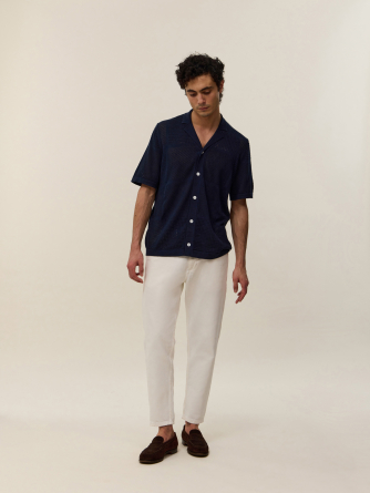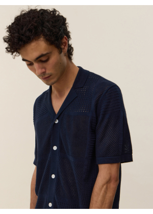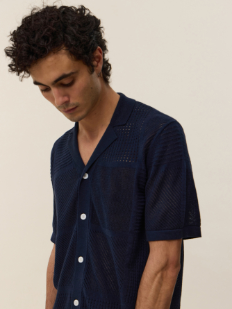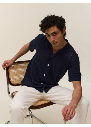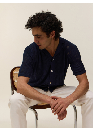 Adoptez Marlon, une pièce d'exception qui floute les lignes entre le polo classique et la chemise. Son col large et sa boutonnière intégrale s'inspirent directement de l'esthétique vintage des années 70, revisitée avec une touche de modernité et de caractère. Sa maille ajourée aux motifs géométriques joue avec la transparence pour un effet résolument graphique et estival.