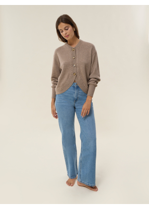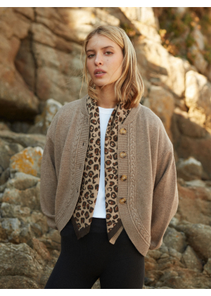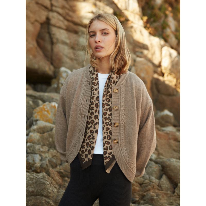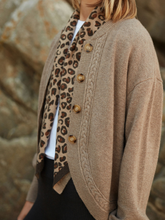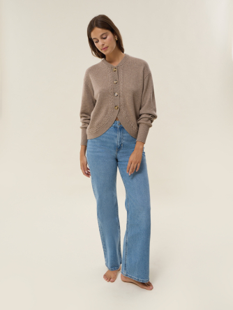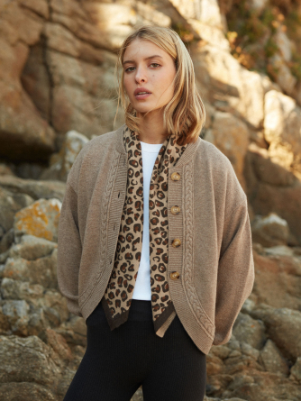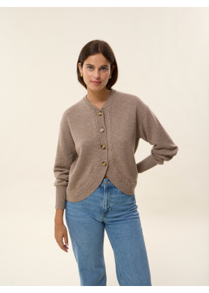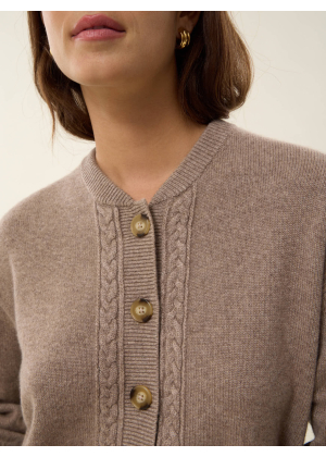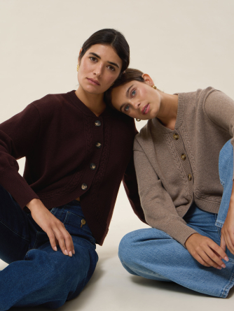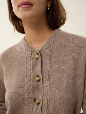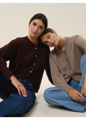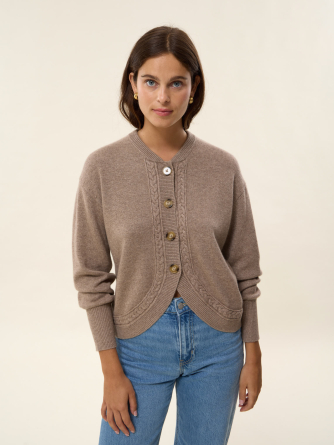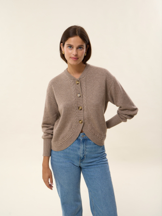 Here is our Victoire cardigan, knitted in 100% 4-ply cashmere, offering a piece that is both warm and structured. Its reimagined teddy collar adds a modern and feminine touch, while the straight cut and rounded hem enhance the silhouette with fluidity. A braided knit detail highlights the refined knitting craftsmanship of this model.