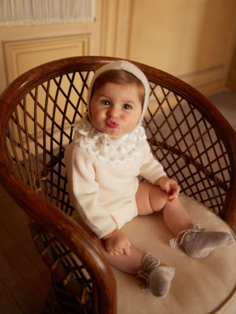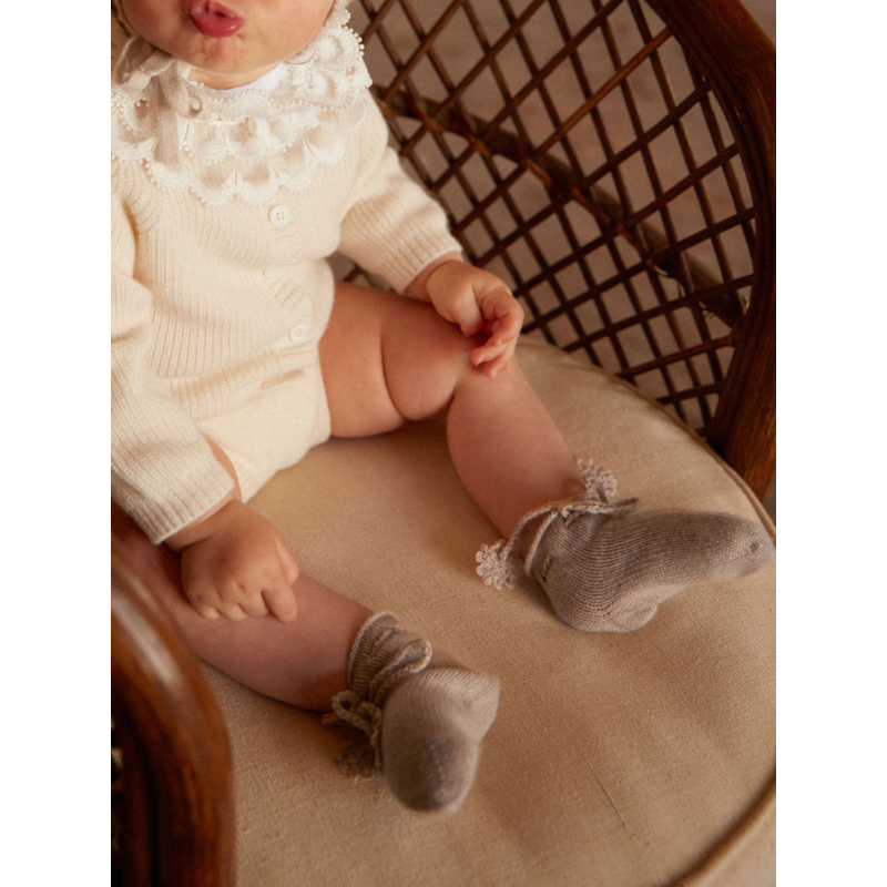 Knitted in 4-ply cashmere, they combine warmth, comfort, and lightness, while adding a naturally elegant touch to baby’s first outfits.