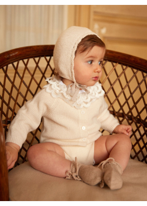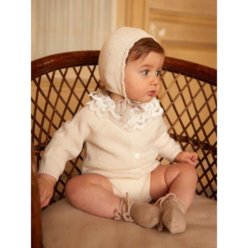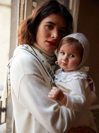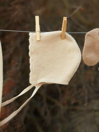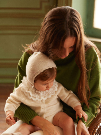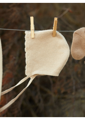 Our Gab bonnet is a must-have for the first months, combining timeless charm with absolute comfort. Knitted in 4-ply cashmere, it wraps baby’s head in gentle warmth, perfect for chilly days.