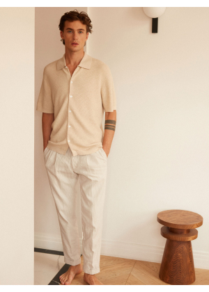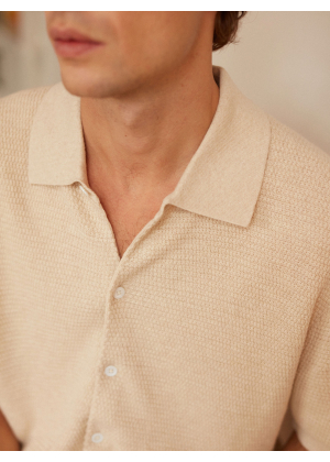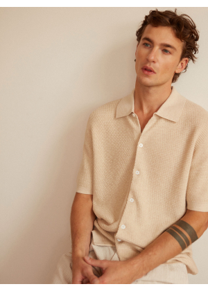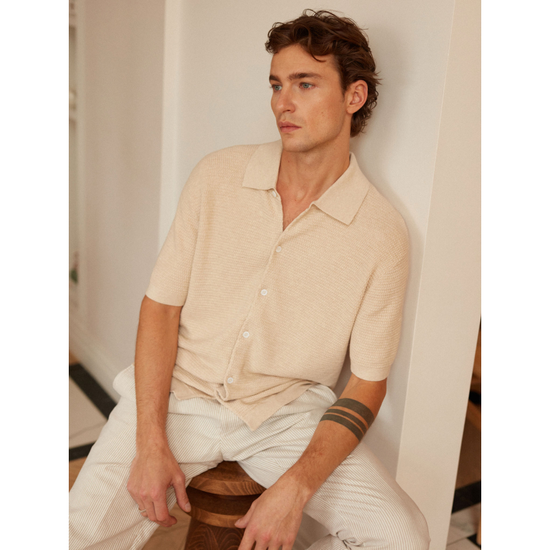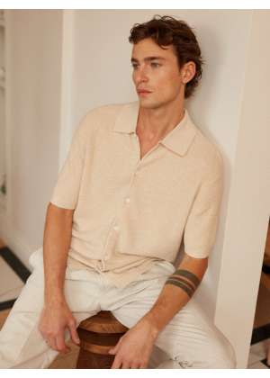 Halfway between the shirt and the polo, here is Zev, our essential for the summer season. This model in 2-ply cotton cashmere knit features a button placket for a subtle nod to the 70's. Its little extra: its vintage fancy knit.