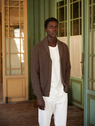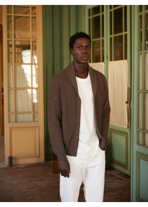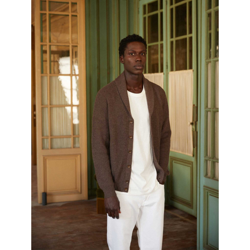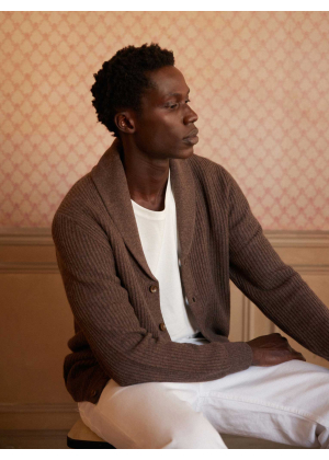 Knitted in 100% 4-ply cashmere, our Yeleg cardigan is an iconic piece of the men's wardrobe. Its shawl collar and thick English rib knit will bring character to your outfits. It can be worn over a t-shirt for a casual look or over a shirt for a more formal look.