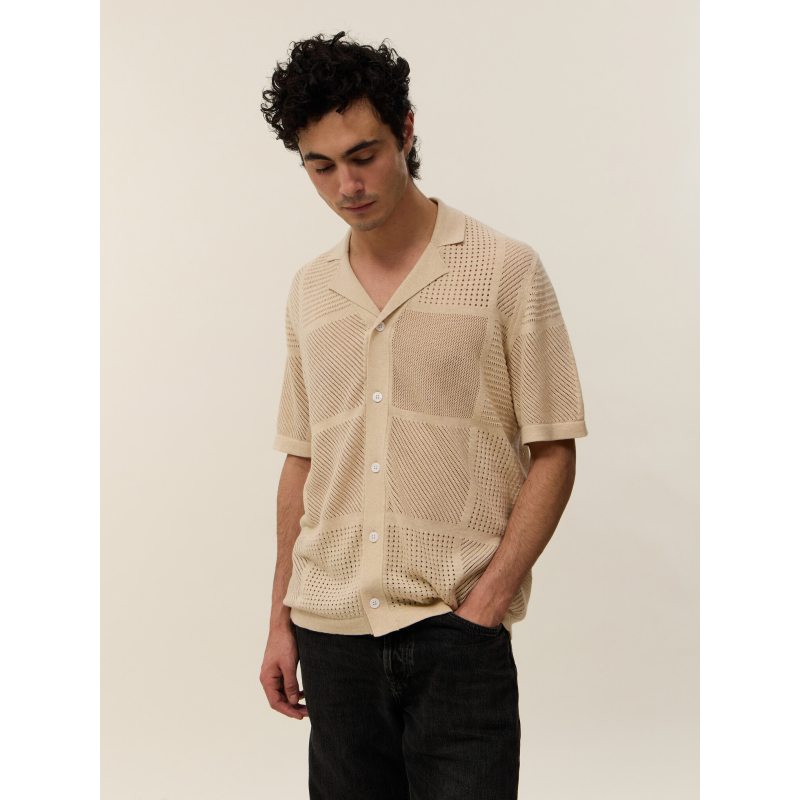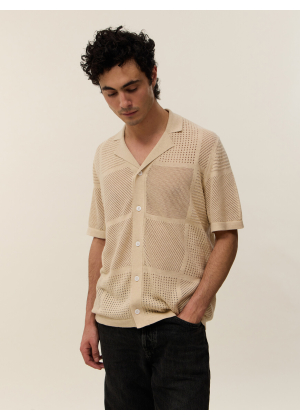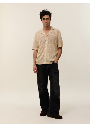 Choose Marlon, an exceptional piece that blurs the lines between the classic polo and the shirt. Its wide collar and full button placket draw direct inspiration from the vintage aesthetic of the 1970s, reinterpreted with a modern and distinctive touch. Its openwork knit with geometric patterns plays with transparency, creating a graphic and summery look.