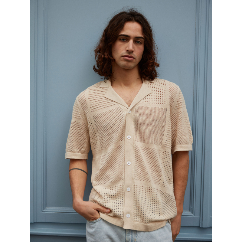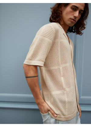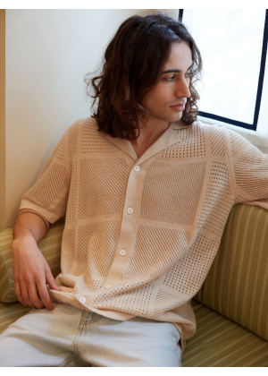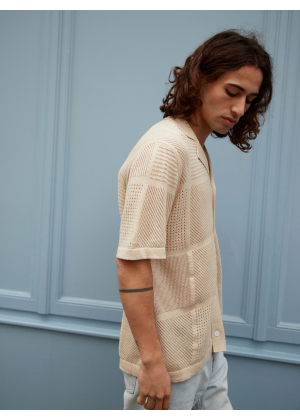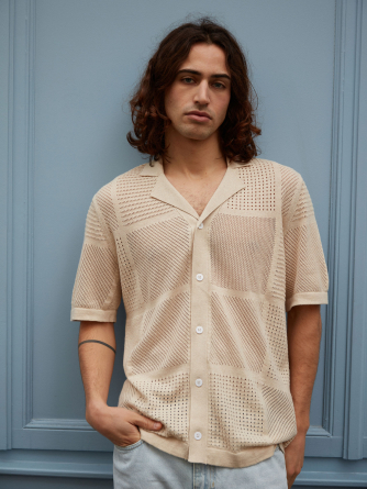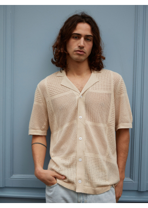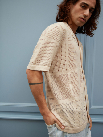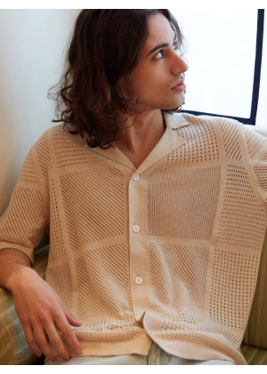 Choose Marlon, an exceptional piece that blurs the lines between the classic polo and the shirt. Its wide collar and full button placket draw direct inspiration from the vintage aesthetic of the 1970s, reinterpreted with a modern and distinctive touch. Its openwork knit with geometric patterns plays with transparency, creating a graphic and summery look.