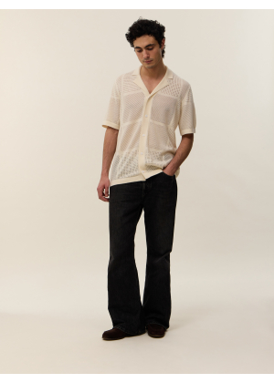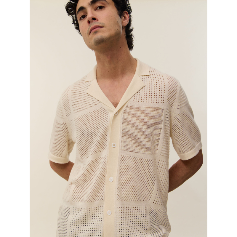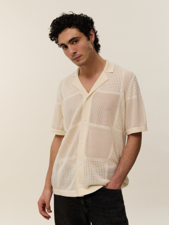 Choose Marlon, an exceptional piece that blurs the lines between the classic polo and the shirt. Its wide collar and full button placket draw direct inspiration from the vintage aesthetic of the 1970s, reinterpreted with a modern and distinctive touch. Its openwork knit with geometric patterns plays with transparency, creating a graphic and summery look.