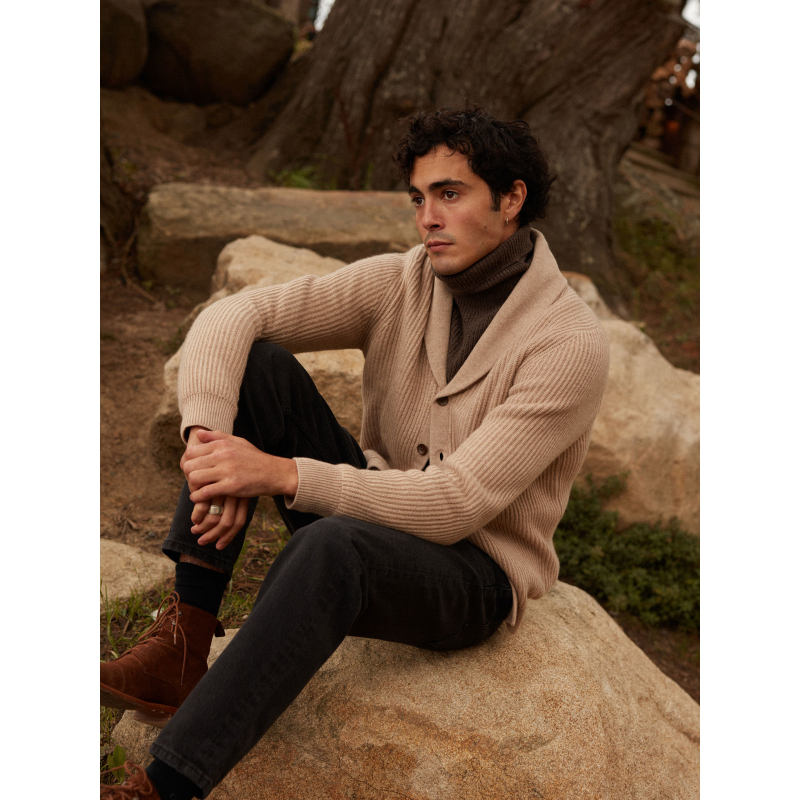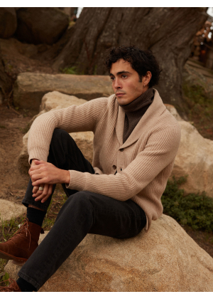 Knitted in 100% 4-ply cashmere, our Yeleg cardigan is an iconic piece of the men's wardrobe. Its shawl collar and thick English rib knit will bring character to your outfits. It can be worn over a t-shirt for a casual look or over a shirt for a more formal look.
