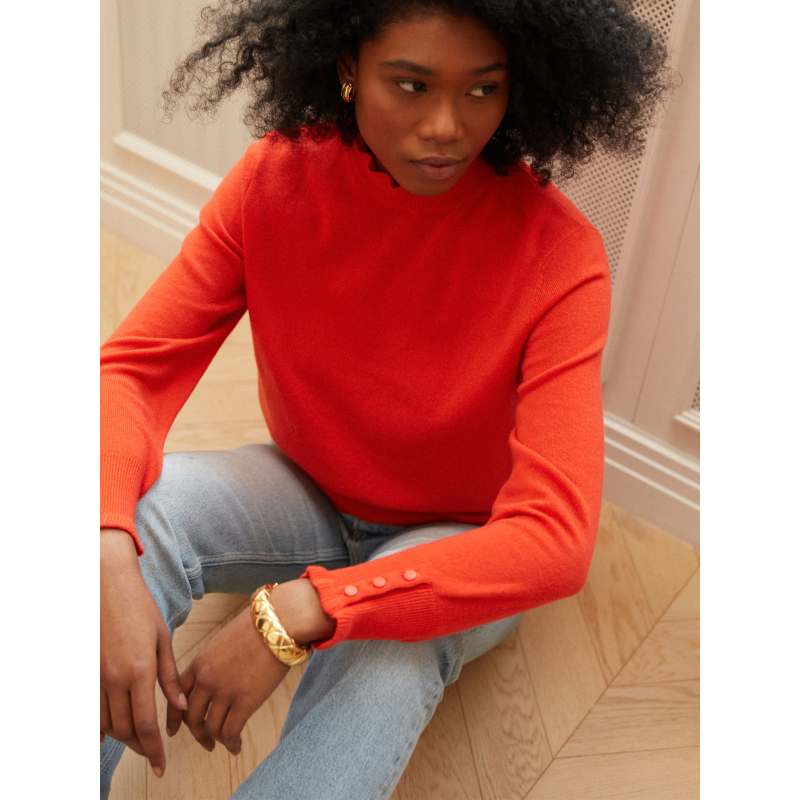 Discover Laya, our 100% cashmere Sweater with a romantic look, knitted in a 2-ply stitch. Its high collar and ruffled cuffs give it a delicate touch of fantasy.