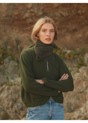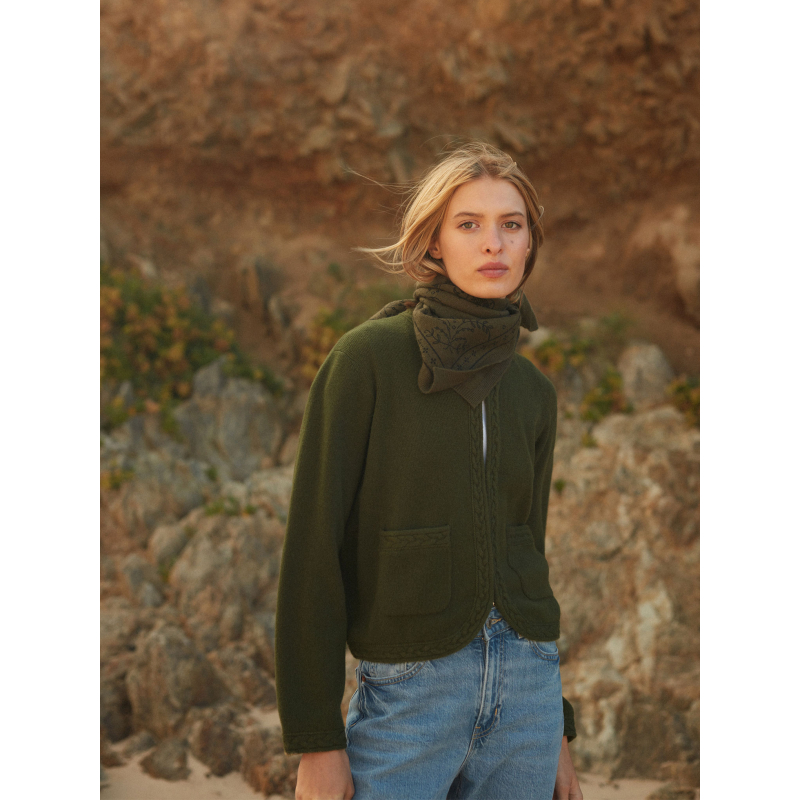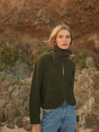 Discover Tessa, a cardigan of pure softness, knitted in 100% 2-ply cashmere. Its straight cut and rounded hem gently follow the silhouette, while its patch pockets make it both practical and elegant. The braided applique detail adds a subtle touch of character.