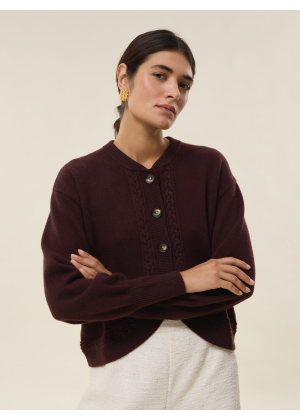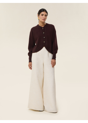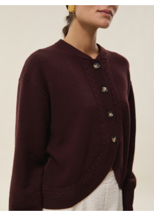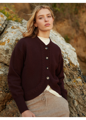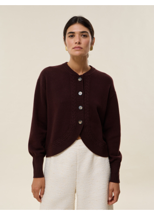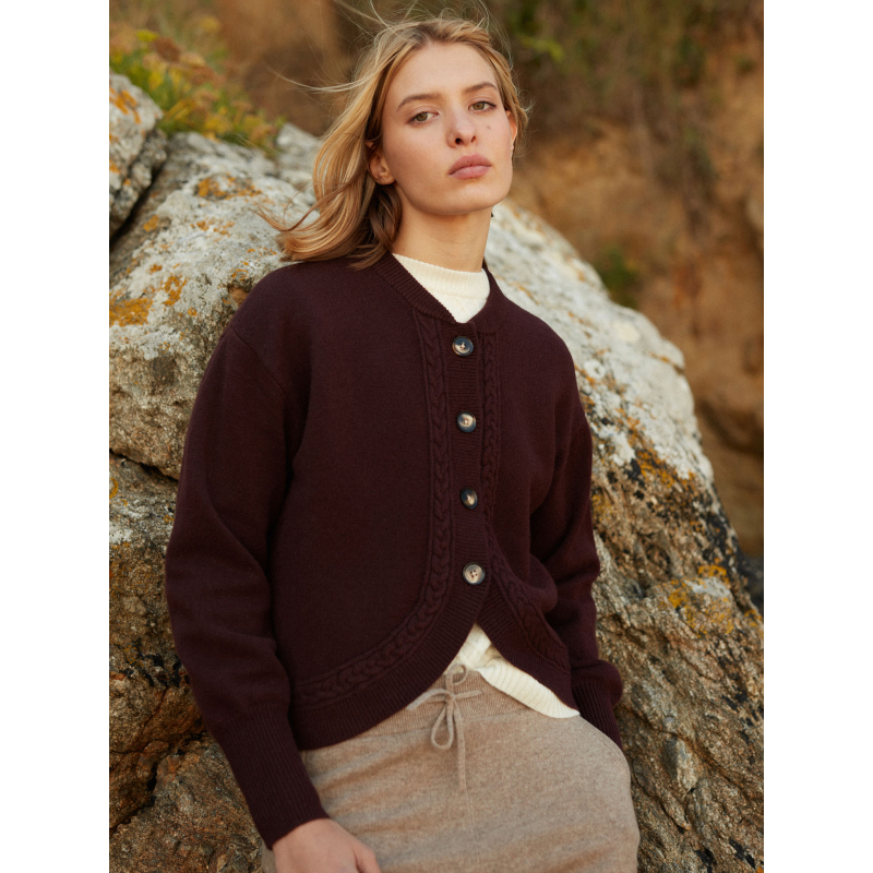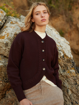 Here is our Victoire cardigan, knitted in 100% 4-ply cashmere, offering a piece that is both warm and structured. Its reimagined teddy collar adds a modern and feminine touch, while the straight cut and rounded hem enhance the silhouette with fluidity. A braided knit detail highlights the refined knitting craftsmanship of this model.