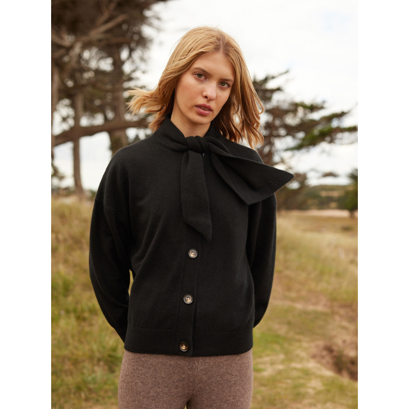 Its tie collar, extended with two panels, adds a touch of originality and femininity, evoking the lightness of a pussy-bow blouse while retaining the relaxed spirit of a cardigan.