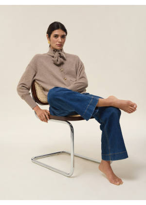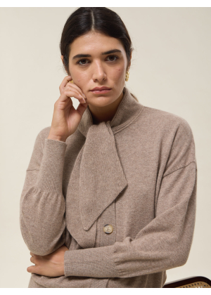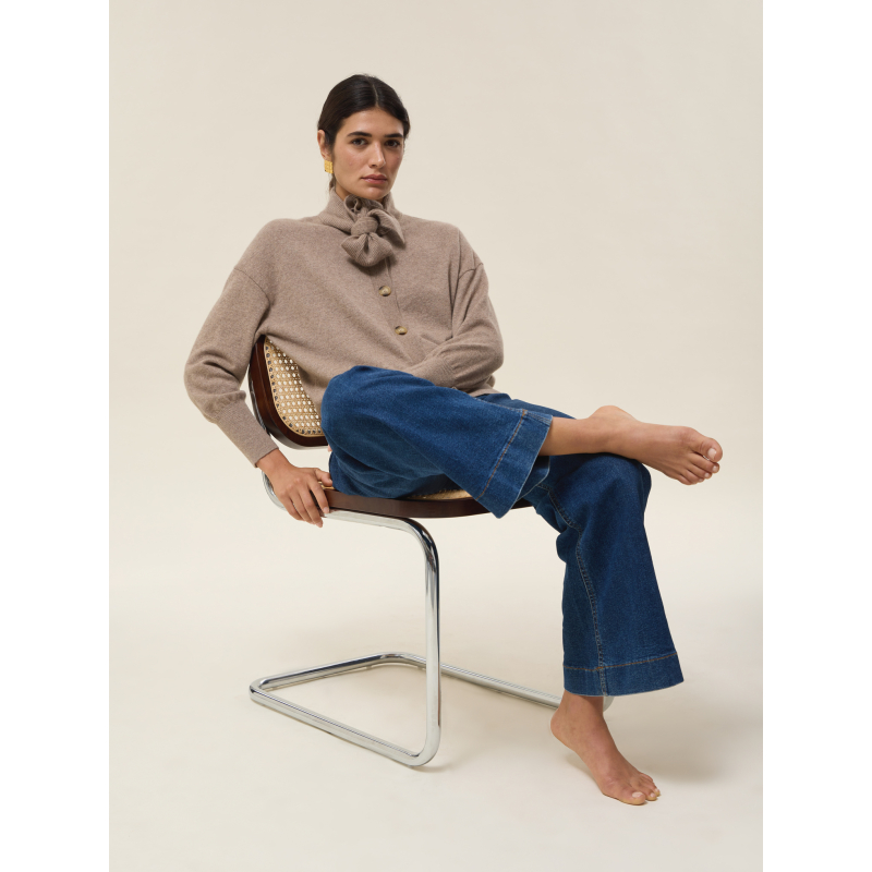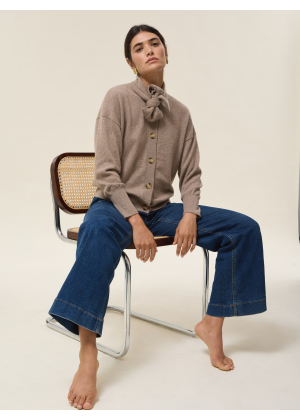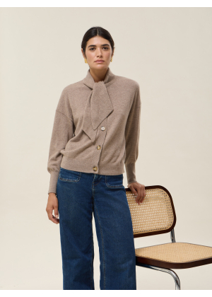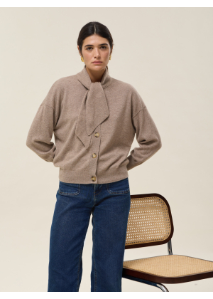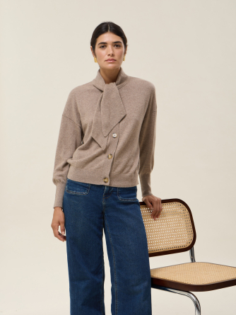 Its tie collar, extended with two panels, adds a touch of originality and femininity, evoking the lightness of a pussy-bow blouse while retaining the relaxed spirit of a cardigan.