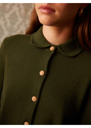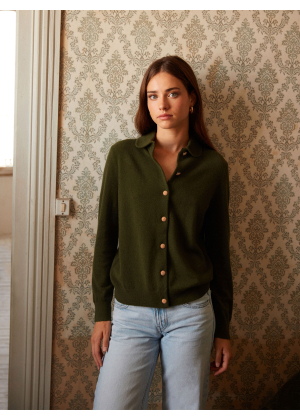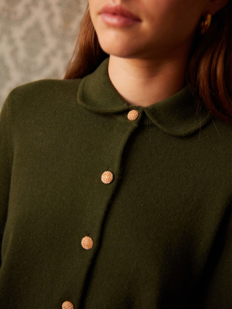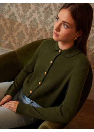 Meet Rose, our shirt-cardigan knitted in 2-ply 100% cashmere, designed to combine refinement and comfort. Its Peter Pan collar in Milano stitch adds a retro and feminine touch, while the jersey knit ensures a soft and elegant drape. The straight cut flatters all silhouettes, enhanced by delicate gold buttons as closures.