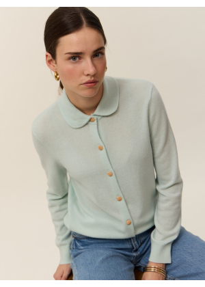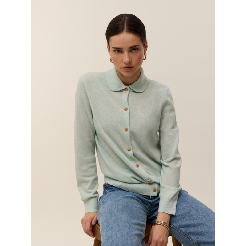 Meet Rose, our shirt-cardigan knitted in 2-ply 100% cashmere, designed to combine refinement and comfort. Its Peter Pan collar in Milano stitch adds a retro and feminine touch, while the jersey knit ensures a soft and elegant drape. The straight cut flatters all silhouettes, enhanced by delicate gold buttons as closures.