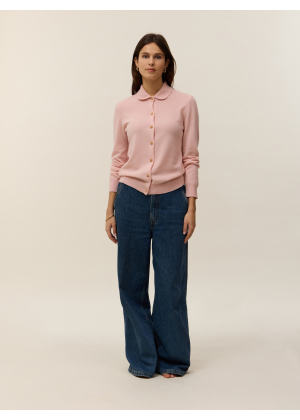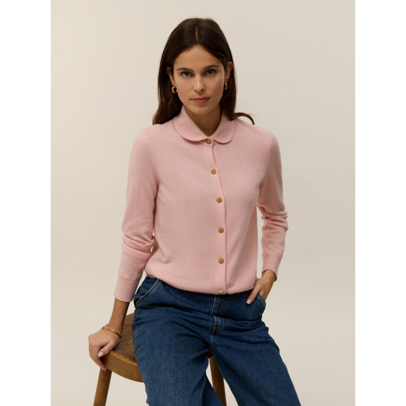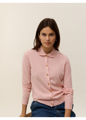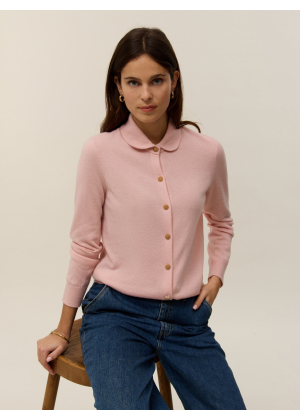 Meet Rose, our shirt-cardigan knitted in 2-ply 100% cashmere, designed to combine refinement and comfort. Its Peter Pan collar in Milano stitch adds a retro and feminine touch, while the jersey knit ensures a soft and elegant drape. The straight cut flatters all silhouettes, enhanced by delicate gold buttons as closures.
