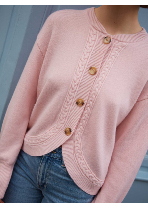 Here is our Victoire cardigan, knitted in 100% 4-ply cashmere, offering a piece that is both warm and structured. Its reimagined teddy collar adds a modern and feminine touch, while the straight cut and rounded hem enhance the silhouette with fluidity. A braided knit detail highlights the refined knitting craftsmanship of this model.