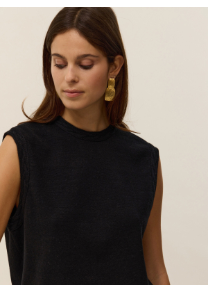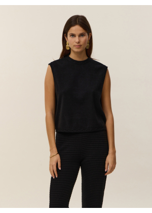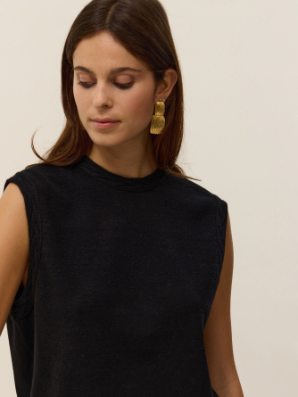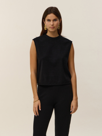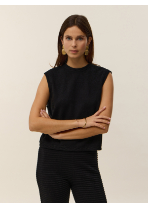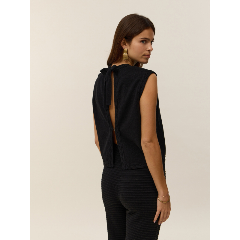 Discover Anita, a sleeveless top crafted from 2-ply cotton cashmere that combines softness and lightness. Its clean straight cut is enhanced by an open back tied with a delicate bow at the top, revealing a graceful open back for a fluid and elegant silhouette.