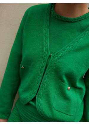 Patch pockets and a slightly rounded hem soften the lines of the cardigan, making it both practical and elegant.
