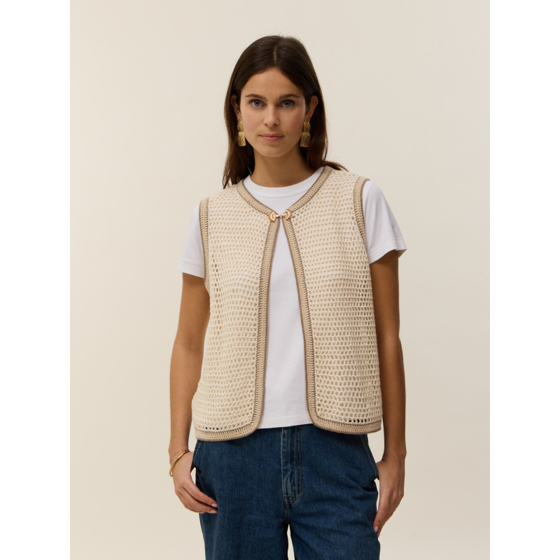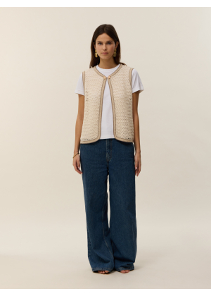 Discover the Léonie vest, knitted in cotton cashmere. Its sleeveless straight cut and cable-twist knit pattern give it an elegant and timeless look. Delicate crochet finishes add a refined artisanal touch. Easy to style, it can be worn over a light top or a shirt to complete your outfits with elegance.