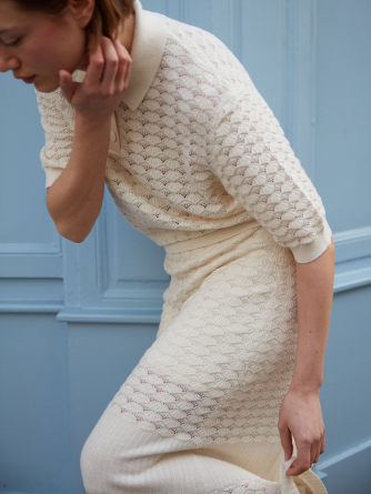Introducing the Coquillage polo, our shell-knit polo designed to bring freshness and femininity to your wardrobe. Featuring a polo collar, three buttons and short sleeves, it combines lightness and elegance, perfect for milder days. Its shell-pattern knit adds delicate texture that enhances its clean and contemporary style.