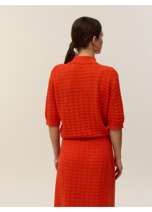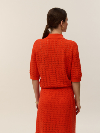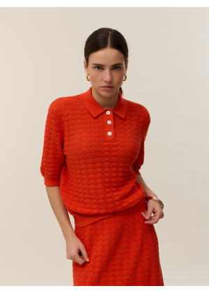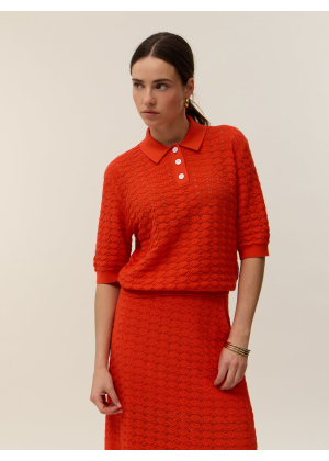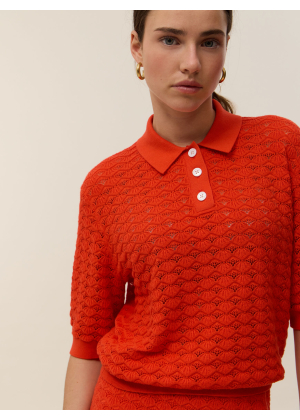 Introducing the Coquillage polo, our shell-knit polo designed to bring freshness and femininity to your wardrobe. Featuring a polo collar, three buttons and short sleeves, it combines lightness and elegance, perfect for milder days. Its shell-pattern knit adds delicate texture that enhances its clean and contemporary style.