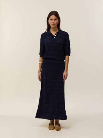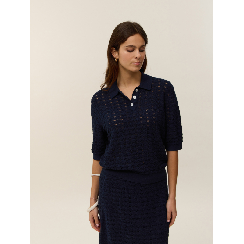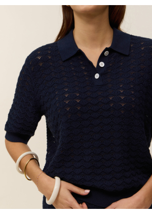 Introducing the Coquillage polo, our shell-knit polo designed to bring freshness and femininity to your wardrobe. Featuring a polo collar, three buttons and short sleeves, it combines lightness and elegance, perfect for milder days. Its shell-pattern knit adds delicate texture that enhances its clean and contemporary style.