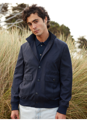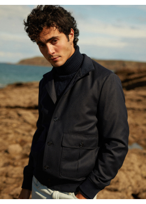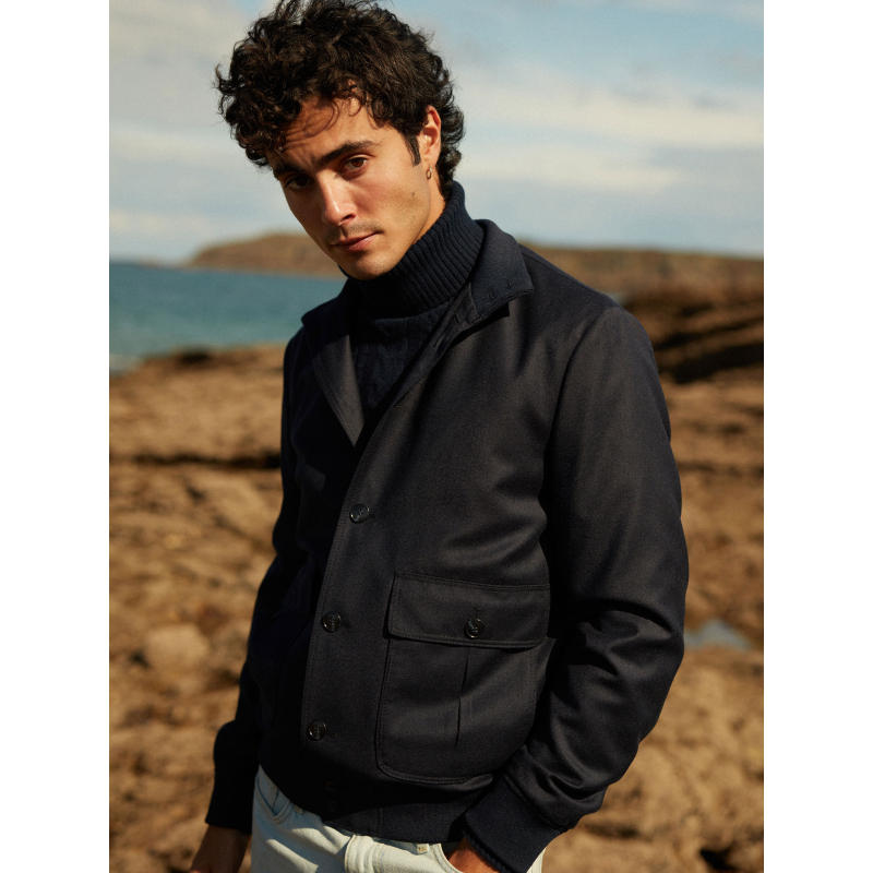 Voici Jack, notre bomber au style affirmé, confectionné dans un tissu d’exception en laine et cachemire, fabriqué en Italie.